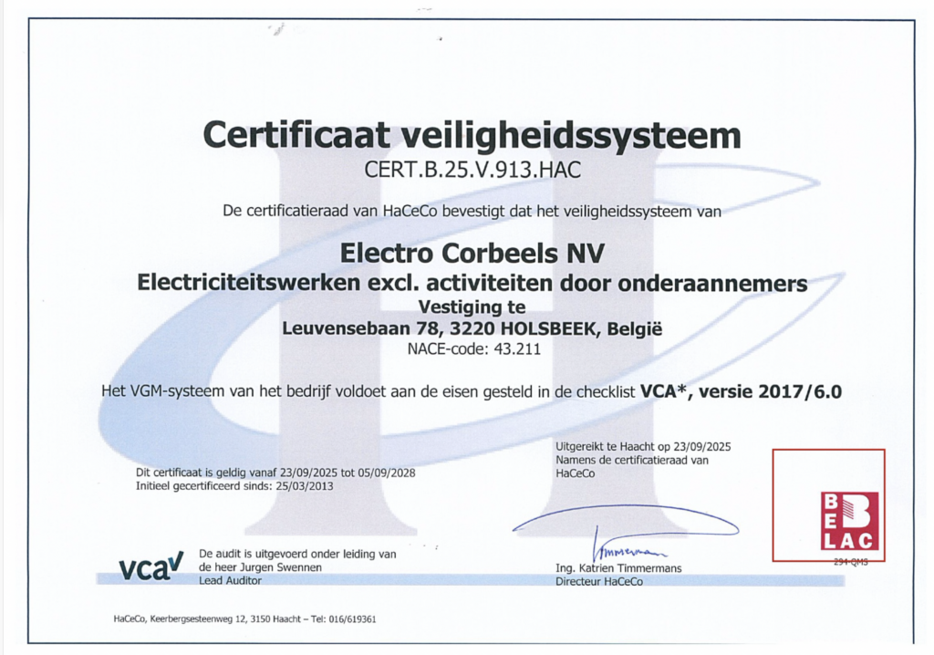 ELECTRO CORBEELS bezit het veiligheidscertificaat VCA** dat nu gecertificeerd is in de versie 2017/6.0, wat bewijst dat veiligheid voor ons een continue bezorgdheid is. Daarnaast behaalde onze onderneming, zowel in 2009 als in 2011 de “Trends Gazellen Award”, als sterk groeiende KMO in Vlaams-Brabant.